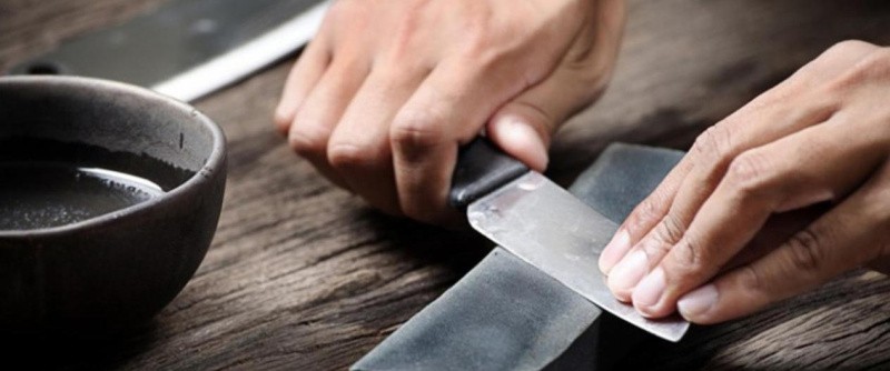 Точильные камни рекомендуется перед началом работ смачивать водою, чтобы они не засорялись металлической стружкой и не царапали лезвие. Точить следует плавными движениями, плотно прижимая нож к абразивной поверхности, но без сильного надавливания. Направление проводки всегда должно быть перпендикулярным режущей кромке. Повторять движения нужно до образования на обратной стороне небольшого заусенца. После этого, переверните клинок и заточите другую сторону.