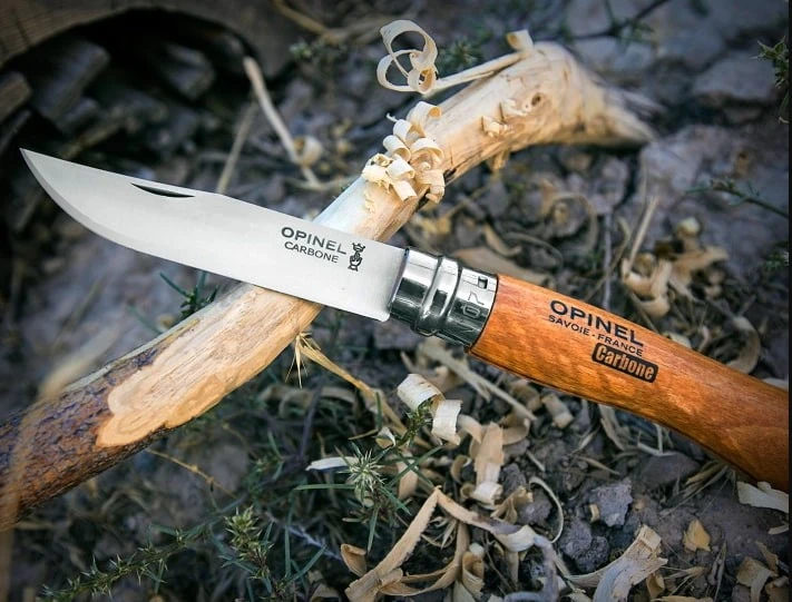 Что касается углеродистой стали – это более прихотливый материал, требующий более тщательного ухода. Но именно его особенно ценят ножеманы. Такой сплав является традиционным, в отличие от нержавейки, используется человеком уже очень давно. Его главное отличие – высокая твердость. Это позволяет лезвию дольше сохранять остроту, но и затачивать его сложнее. Такой нож лучше справляется с нарезанием твердых материалов. После работы с продуктами, солями, лезвие следует промыть водой и насухо вытереть. Клинки из углеродистой стали Opinel помечает словом “Carbon”.