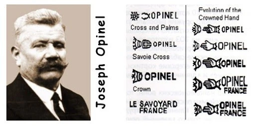 А в 1909 году Жозеф Опинель разработал логотип, который служит отличием оригинальных ножей от подделок и копий. Фирменным знаком и по сегодняшний день является коронованная рука с двумя поднятыми вверх пальцами. Есть мнение, что данный логотип был взят с герба города Saint Jean de Maurienne.
