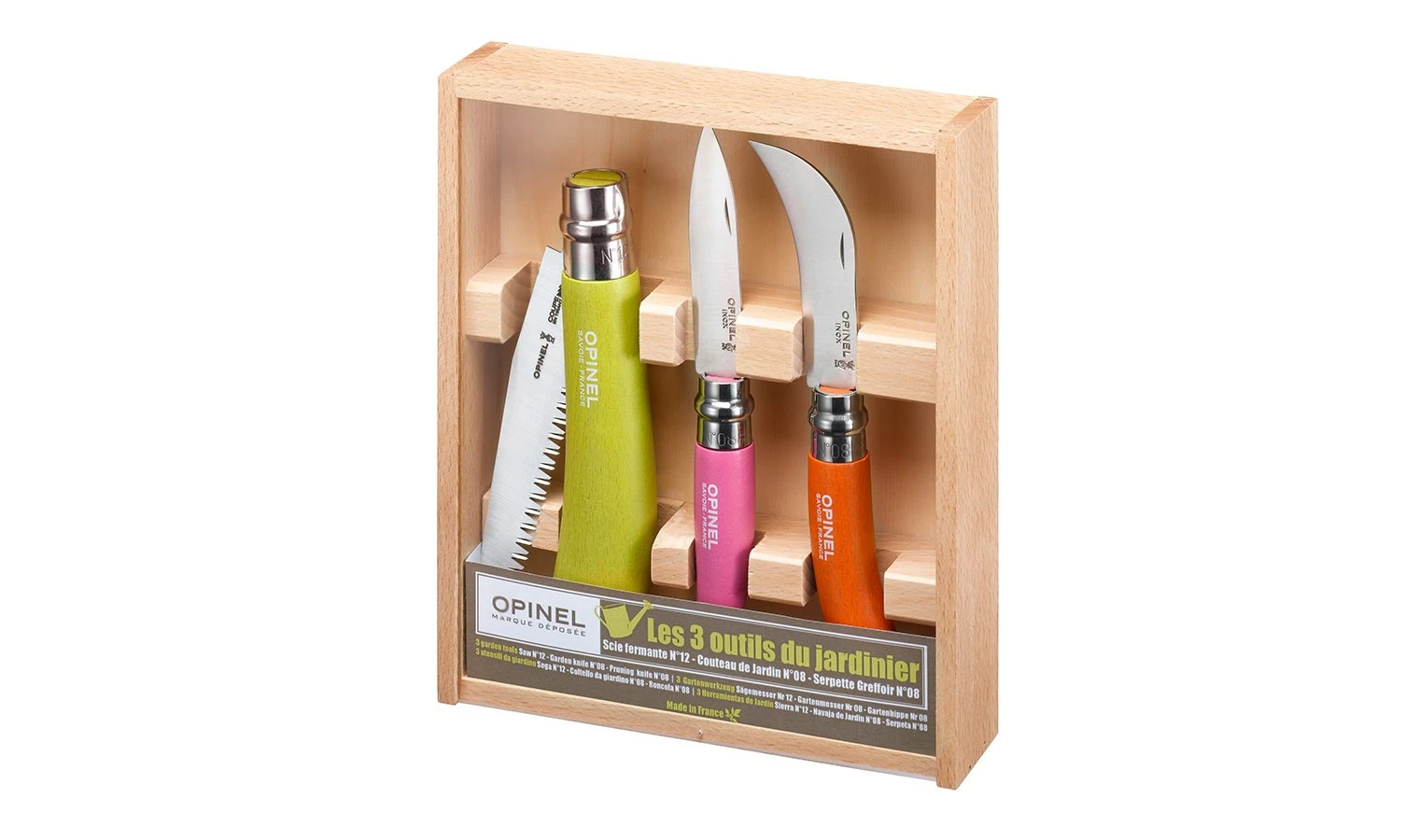 Ножи Opinel действительно разнообразны, и компания заботится о том, чтобы предложить своим покупателям именно те модели, в которых они нуждаются. Поэтому не осталась без внимания и такая сфера, как садовые работы. Причем, к данному вопросу инженеры компании подошли так же тщательно, как и в случае создания остальных ножей. Все инструменты изготавливаются из тех же надежных материалов, что и складные клинки. Из металлов — это нержавеющая и углеродистая сталь, которая выплавляется в различных странах Европы. Для рукояток используется дерево, а также некоторые разновидности пластика.