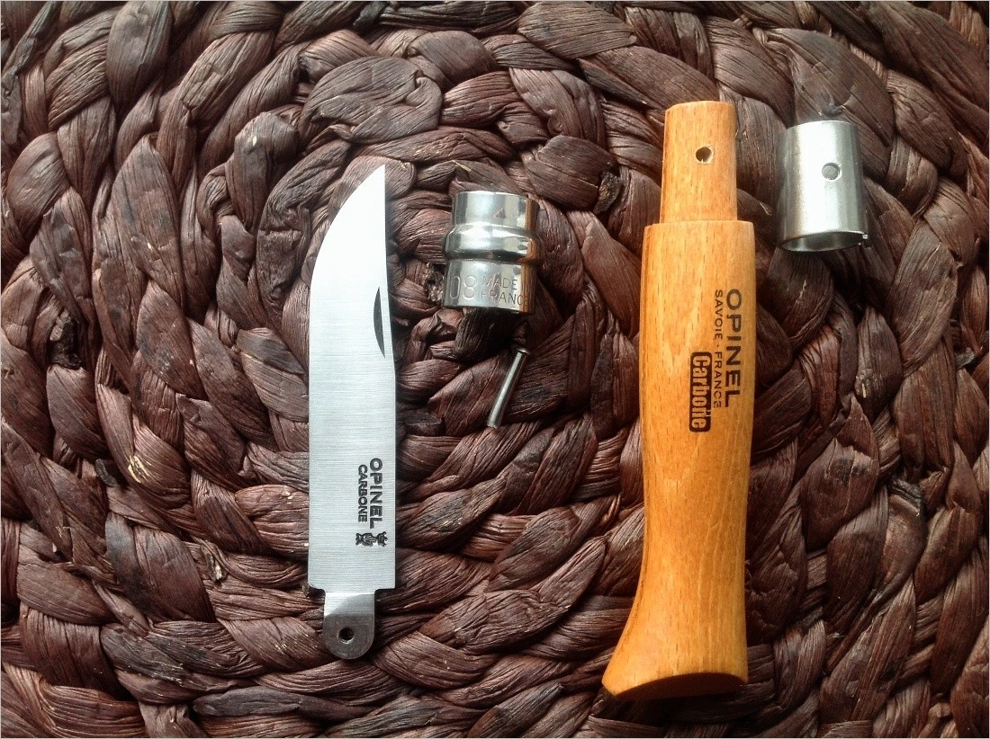 - клинок. Пожалуй, это самая главная часть любого ножа. В случае Опинель №8, он изготовлен из нержавеющей стали марки Sandvik 12C27 или из высокоуглеродистой ХС90;