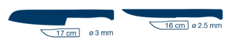 Имеет жесткое, стабильное лезвие. Техника нарезания немного отличается от предыдущего с острым концом. Больше годится для разовых режущих движений. Неровная поверхность клинка, как у №219 позволяет удобно нарезать морепродукты, сыр, помидоры и другие “липкие” материалы. Канавки на клинке снижают прилипание продуктов. Длина составляет примерно 17-20 см. Обух прочный – 3 мм.