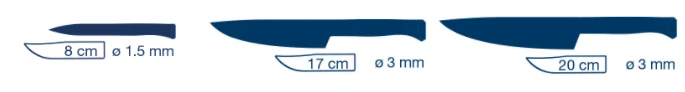 Практически для любых работ с едой лучше всего выбрать клинок длиной около 8-12 см, с толщиной обуха – 1,5 мм. Это достаточно универсальный вариант, которым можно начистить и нарезать овощи, хлеб, колбасу, другие составляющие для бутербродов и т.д. Часто их используют в офисах. Тонкое острое лезвие способствует достаточно точному резу, позволяет выполнять даже деликатную работу по нарезанию тонкими ломтиками помидоров, рыбы и пр. Часто используется на кухне, в походах. Ему всегда найдется применение при приготовлении пищи. Пример – LOFT N°125 (как и вся не серрейторная серия №125) и №126. Серрейторные модели лучше справятся с нарезанием таких продуктов, как помидоры, киви, вареные яйца и т.д.